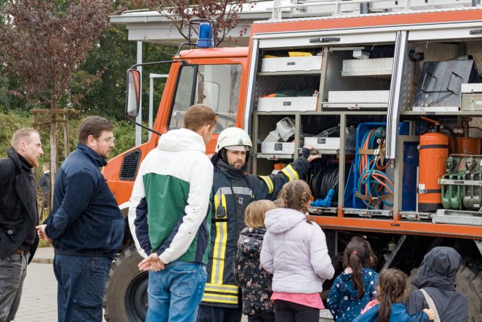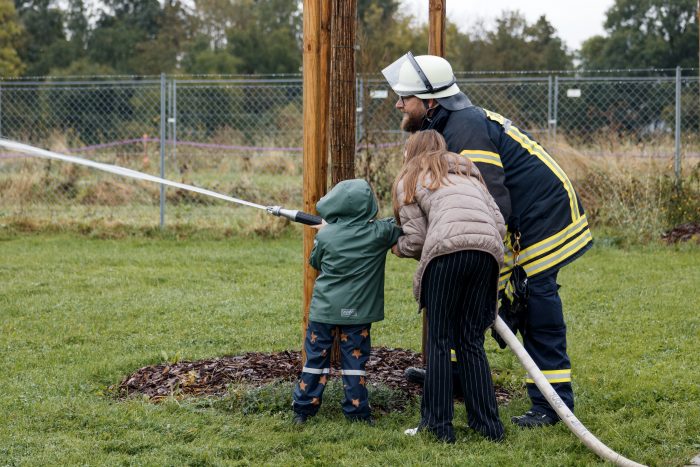 Mit großen Augen folgen die Kinder den Einsatzfahrzeugen der Feuerwehr, die mit Blaulicht auf den Hof fahren. Zwölf Feuerwehrmänner und –frauen springen in voller Montur heraus, laden Schläuche und allerhand Ausrüstung aus und beginnen mit dem Aufbau von Löschstation und Slalomparcours.